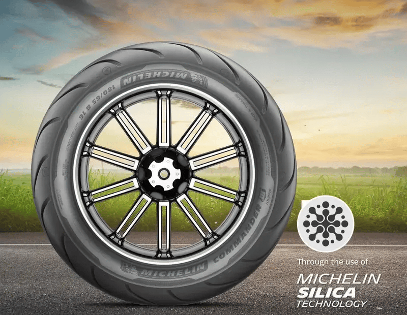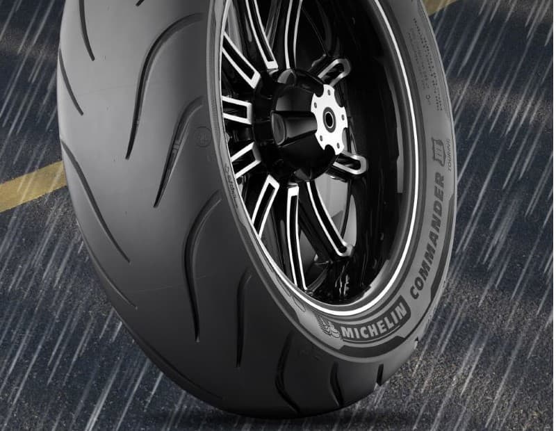 A bit of weather won't sideline a seasoned rider and it certainly won't faze these Michelin Commander III Touring tires. They've truly upped their game for when the asphalt gets slick. The Silica Rain Technology in the rubber gives 'em tenacious grip on damp roads and those deep, straight grooves channel water right out from under you. Means you stay planted, in command, come sunshine or downpour.