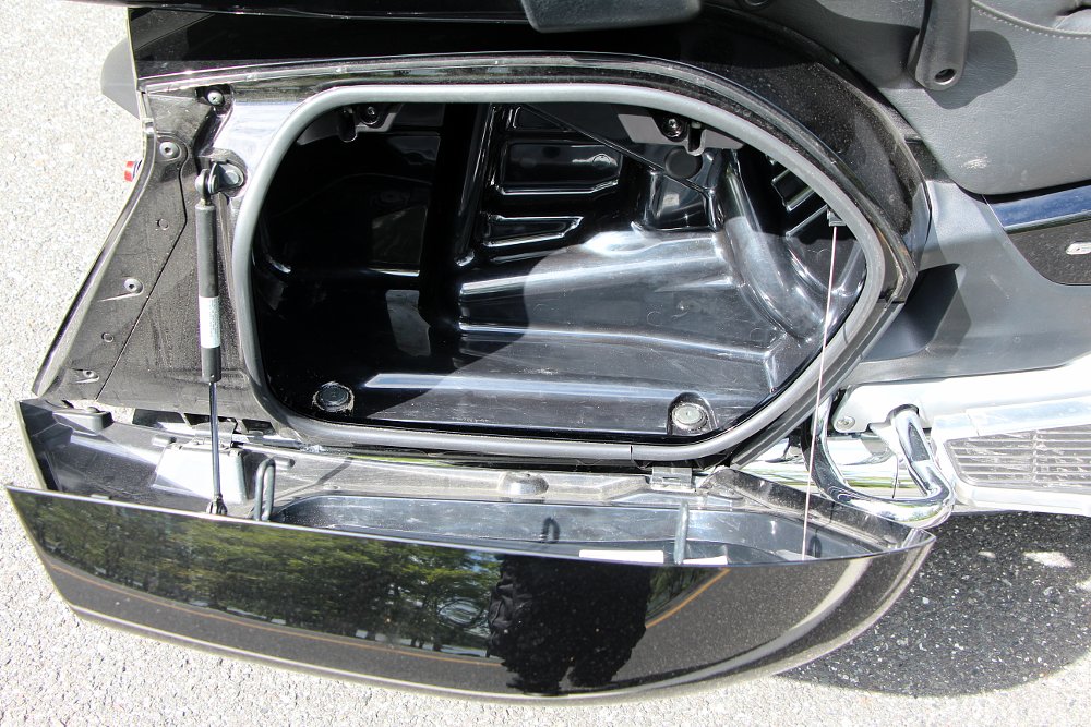 Carrying capacity is staggering. The saddlebags and topcase are easily opened in an obtrusive spot under the topcase itself with three latches arranged intuitively. The topbox can be opened remotely with a button on the key fob, as well. Each sidecase has a hydraulic damper for opening, which I found to be a nice touch. The amount of room — about 150 liters — makes packing really easy. Here was my general rule of thumb for packing: Will that fit? Yes, it will. Seriously, short of really long items, damn near everything fits. Because I do sometimes carry long items, though, the Wing is screaming for a luggage rack. The whole bike is sleek, shiny integrated luggage, so there is practically no place to lash things like tents or fishin’ sticks. I became a Wingnut instantly: If it fits, I'll bring it. And it will. All of it.