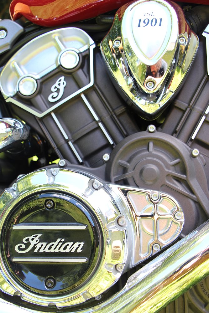 The Scout features a “smart-start” starting system. The starter button is a soft switch. The ECU receives the signal to start the bike, and takes over from there to prevent over- or under-cranking. The Indian may have the antique look, but she’s all modern under the tank.