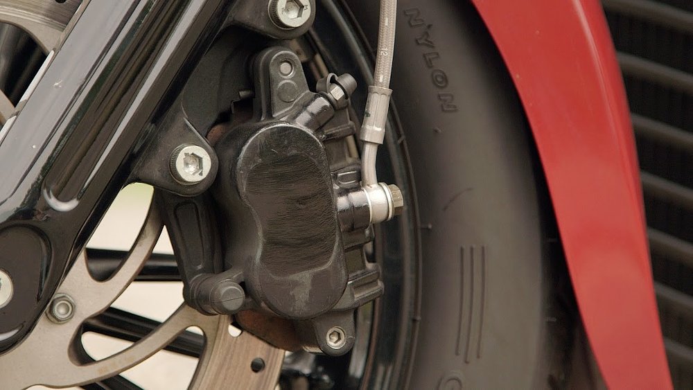 The Scout has a single 298 mm brake rotor on each wheel. The front is squeezed by a two-pot caliper and there's a single-piston piece of hardware in the rear. The setup is basic, but it works.