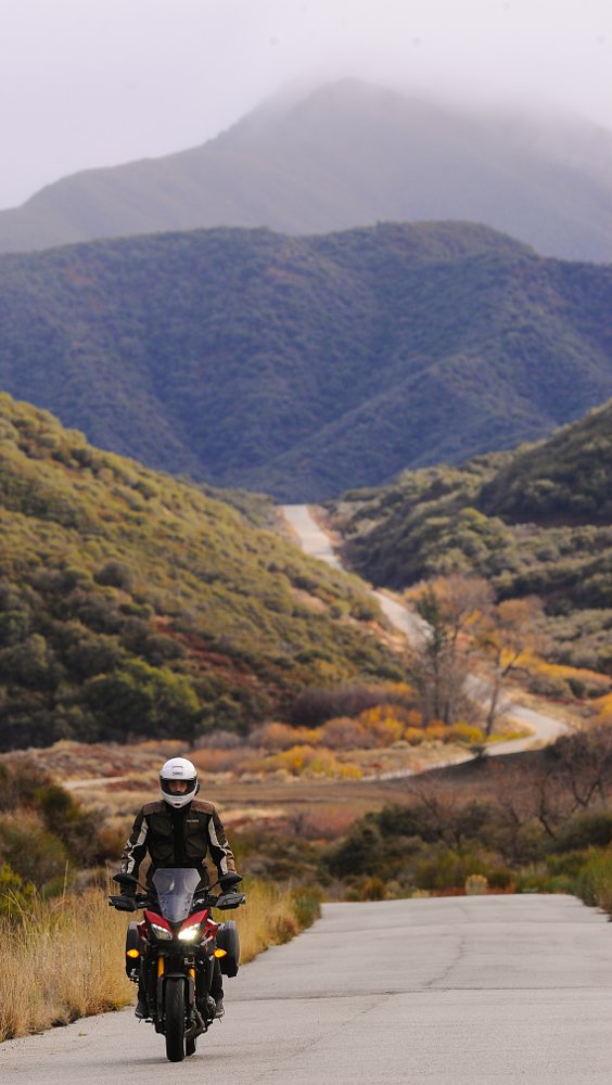 To test the FJ-09, Yamaha took us on a 200-mile loop through the mountains near Santa Barbara, making our way over to the I-5 freeway, and then coming down the Grapevine grade. Our day started cold and wet. Unfortunately, that meant that the best part of our ride, Highway 33, would be spent on wet roads, dodging oil spots and debris washed onto the road by the rain. Trying to look nice for a photo while avoiding the oil slick in the turn and not sliding into our lovely camera guy made things... interesting.