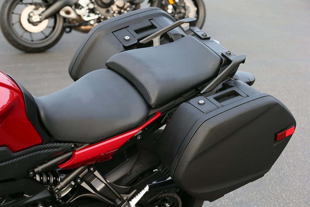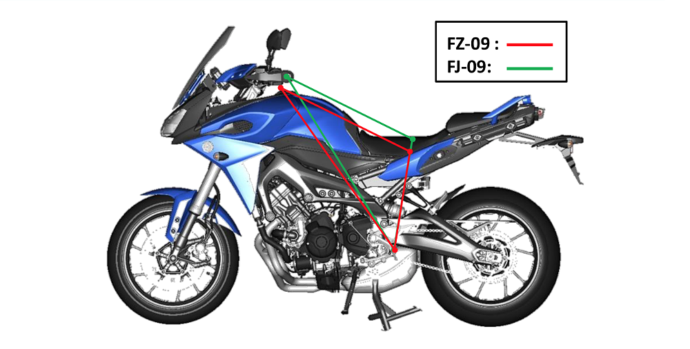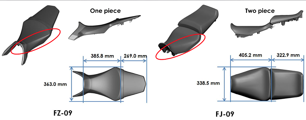 Yamaha made a whole range of changes to the FJ to make it more distance-worthy. The subframe was increased by 130.6 mm to make room for the new seat, which now is split for rider and passenger. The seat is both wider and more flat, and is adjustable to gain 15 mm more height. Yamaha also re-shaped the seat so it has a more rounded edge, compared to abrupt edge found on the seat of the FZ-09.