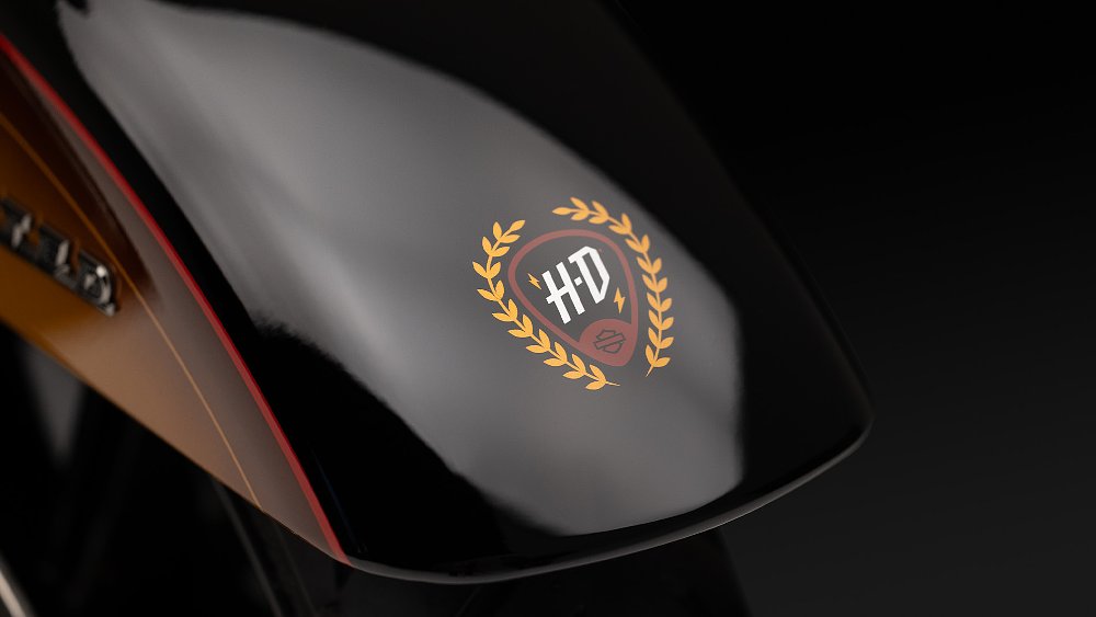 The treatment includes a sunburst fade and a metallic gold panel outlined by a caramel-colored pinstripe; all laid atop Harley’s Vivid Black paint.