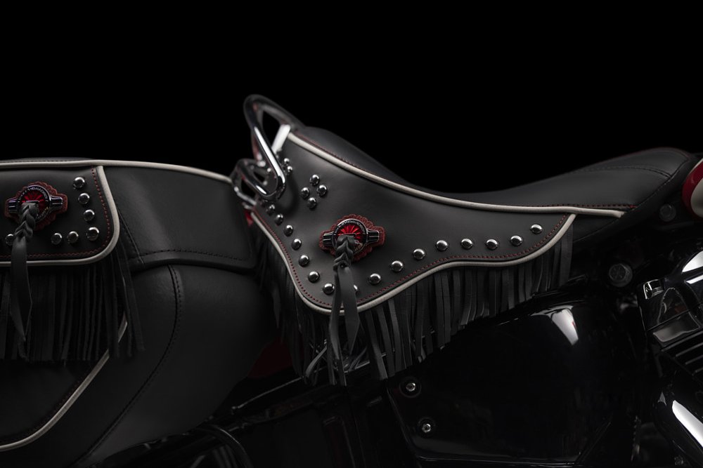 The leatherwork receives just as much attention, with the solo saddle embellished in fringe, studs, and conchos. The saddlebags receive a similar treatment but also benefit from a rigid liner, keyed locks, and water resistance.