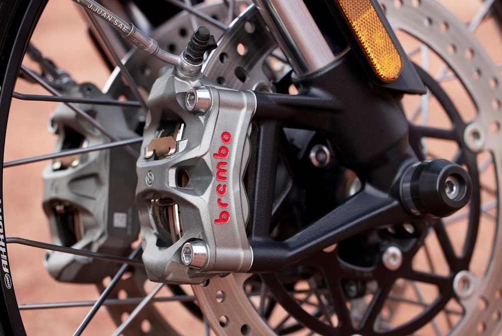 Brembo M50 calipers handsomely equipped the previous-generation XE for both on- and off-road duties. Triumph stepped that up to the Italian firm’s flagship Stylema model in 2024. Often found on class-leading sport bikes and adventure-tourers, the four-pot binders are known for top-tier adjustability, venting, and lest we forget, speed-shedding performance.