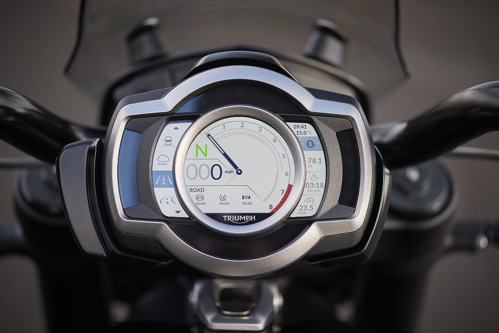 The Rocket 3 Storm also maintains a premium electronics package. Lean-sensitive ABS and traction control promote safety while switchable ride modes adjust throttle response to different circumstances. Cruise control makes the Rocket 3 travel-ready. Triumph packs all that tech into a full-color TFT display.
