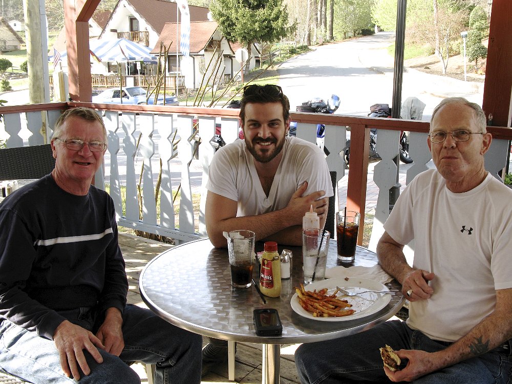 After a quick stop in Suches, Ga., for gas and a Coke, we made our way over to Helen for an early dinner. The roads connecting the two towns were another mass of curves and a splattering of numbered highways. Route 348 was one of the most amazing stretches of blacktop I have ever ridden. Dave and Charlie took a considerable lead, and by the time I reached the restaurant, they were already dismounting from their machines and waving me in.