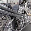 With the bike in his ownership and Born-Free 14 fast approaching, Luke set out to rebuild the bike, retaining its overall look but cleaning things up and finishing it in his own style. Starting with the frame, Luke installed a fresh set of down tubes, added a top motor mount that runs the length of the backbone, and boxed in the neck to stiffen things up. For a cleaner overall finish, he added a fin where the frame and rear end dovetail, boxed in the seat section, and smoothed out the axle plates with some hand-finished molding.