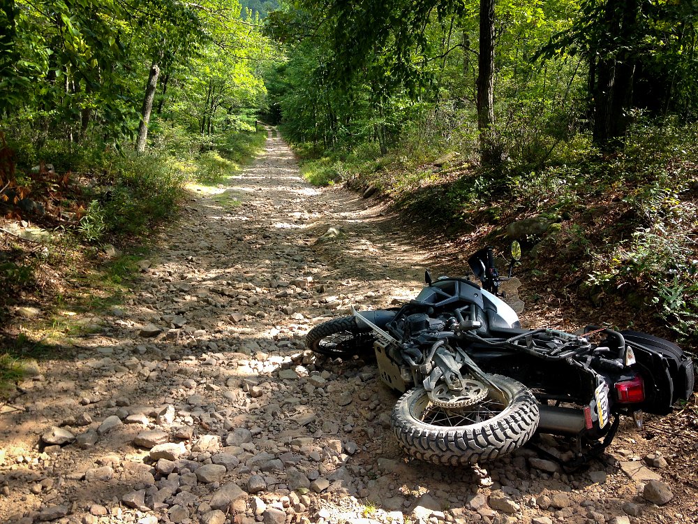 The road changed drastically after the first of three vista overlooks on Poe Paddy Drive. A sign warned of a lack of maintenance just before the packed dirt degraded to large rocks and loose sand. I made it about a half a mile into the mess before I lost the front end on a steep declining hill, dumping the Tiger and tumbling off the trail. While crashing is all part of the fun, picking up 500 pounds of bike on a steep rocky hill was another story.