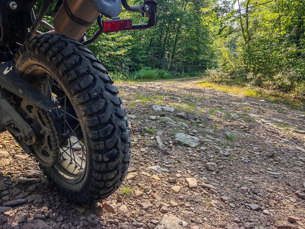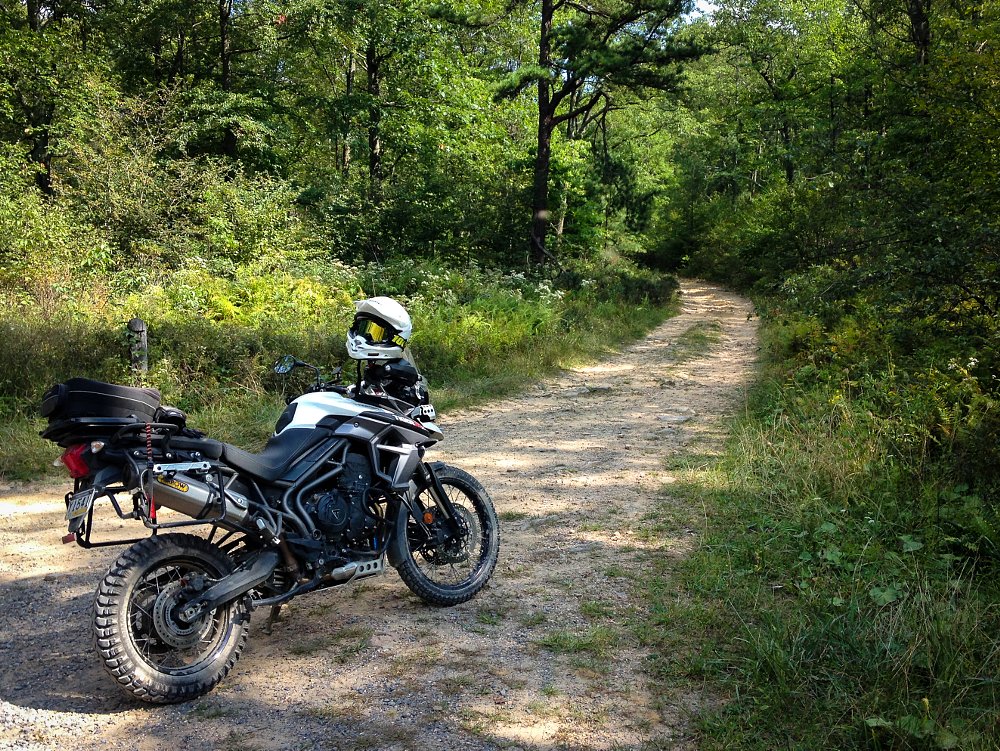 I invaded Bald Eagle State Forest from the east, turning off the four-lane blacktop of Route 322 onto the sandy gravel of Sand Mountain Road. With a quick stop to deflate the Tiger’s newly upgraded Mitas E-07 tires, I was off.