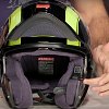 Anthony demonstrates how the Sena 10U is seamlessly integrated into a Shoei Neotec helmet. RevZilla photo.