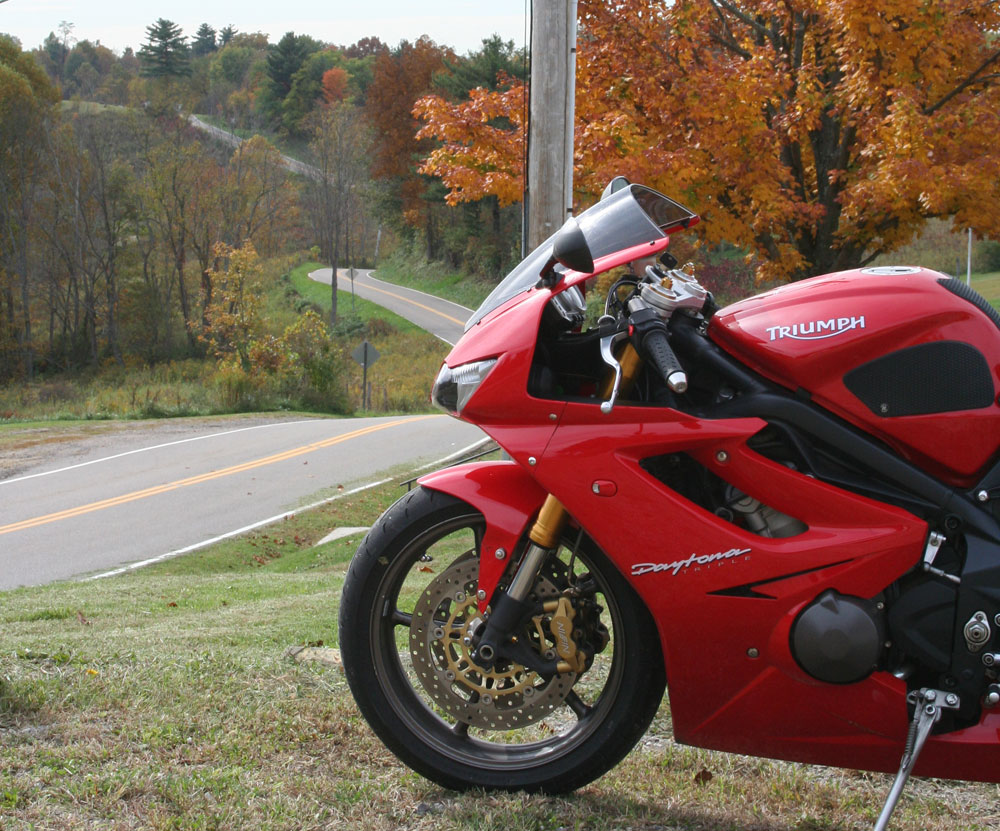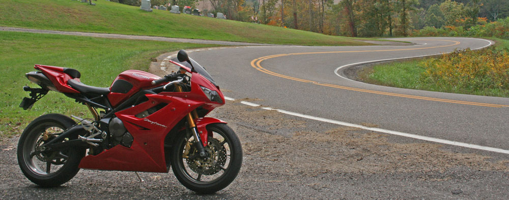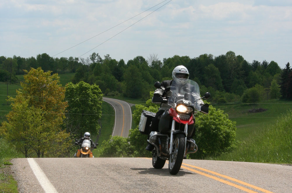 That would be Ohio Route 555 (above), also known as “the triple nickel” and occasionally cursed by riders who come to try the road their friends were talking about and end up with their bikes stuck in a muddy cornfield or skidding down a wooded ravine. If you’re looking for smoothly arcing sweepers that let you settle into a comfortable rhythm, look elsewhere. Route 555 is a diabolical asphalt viper, full of blind rises that are often followed by 90-degree turns that make no sense whatsoever, except to follow the ancient property line of some farmer’s field. There may be gravel or mud in the corners, tracked onto the pavement by farm machinery, or you may lean into a curve to find a horse-drawn Amish buggy moving along at 10 mph and blocking your apex.