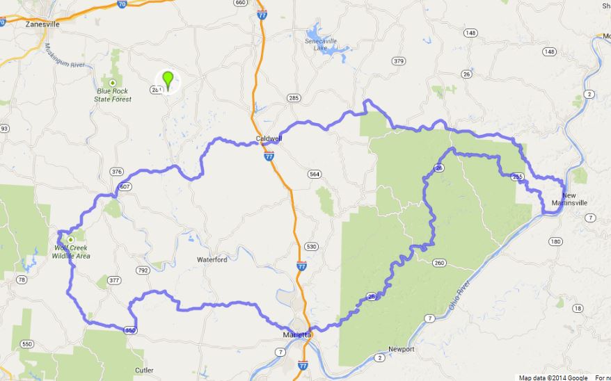 On the west side of Marietta, we pick up another locals-only road, Ohio Route 676. This road saves the best for last, throwing a tight series of turns at us in the last few miles as we cross a wooded ridge. Route 676 drops us onto the one road in this area that does have a bit of a reputation, at least regionally.