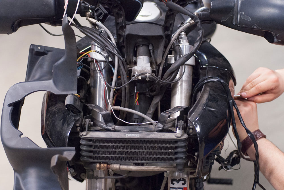 Inside the guts of the Duc. The fairings are off, and the one that shrouds the oil cooler will actually be removed permanently to make way for the new lights. Photo by Ryan Targoff.