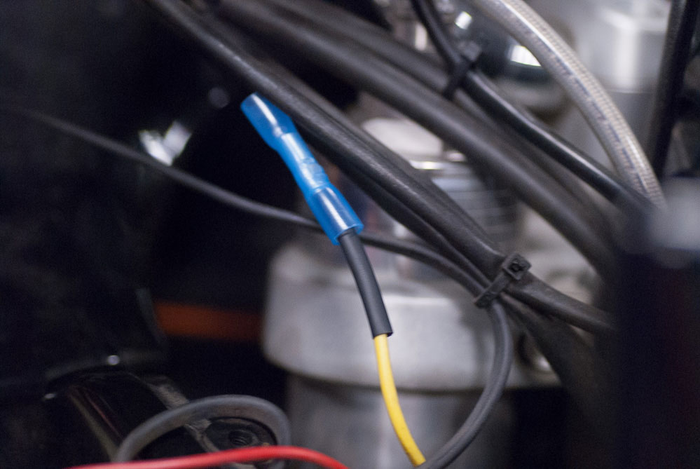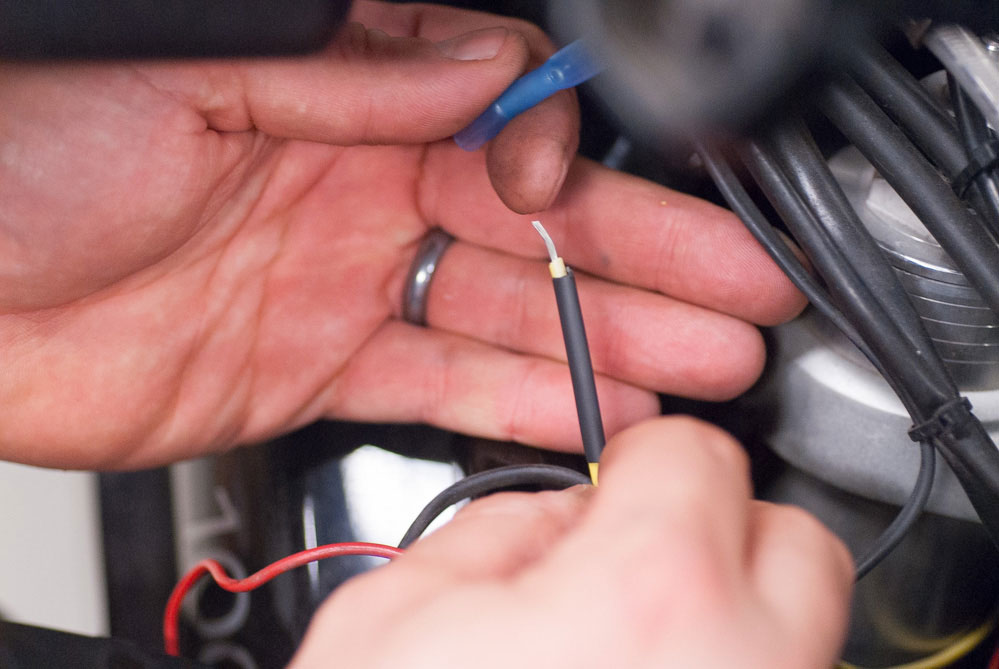 One of Lemmy's wiring tricks is to insert the heat shrink up inside the connector shroud prior to crimping. This gives a nice weather-tight seal when the crimp is applied and the heat shrink assumes its final size. Photo by Ryan Targoff.Keep it waterproof. I have a sequence I follow when crimping. For wiring that is gonna see some weather, like that on a bike, I use heat-shrinkable butt connectors and terminals. I slide my heat shrink up into the connector, then apply heat to both the shrink and the terminal protector, which leaves me with a very water-tight electrical joint as those items fuse to the bare wire and insulation.