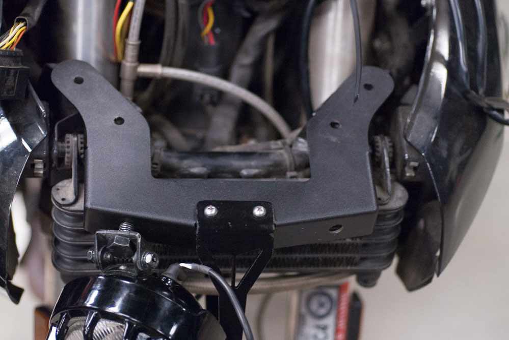 With the wiring run to all the places it needs to go, I then tackled the mechanical installation. Ryan obtained a used bracket that replaced his oil cooler grille permanently. The bracket is a unit specifically made for his bike by an outfit called Strada Avventurosa. It replaces the grille in front of the oil cooler, so while you may look at the photo above and think that the lights are going to reduce air flow to the oil cooler, the bracket actually allows far more air to flow over that area than the OEM grille does. I bolted up the bracket and began mounting the lights.