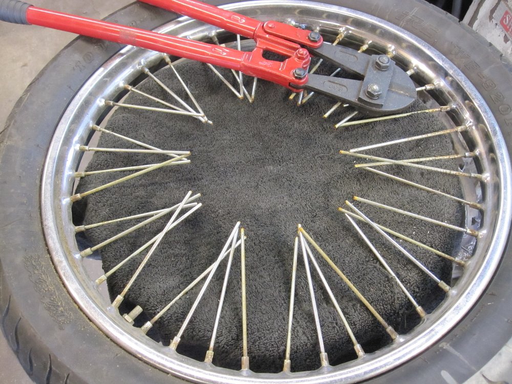 If you are replacing the spokes and nipples, you can save a lot of time by cutting the old spokes out. I like to use a big pair of bolt cutters since they can cut two at a time. Wear safety glasses since the spokes can shoot out, although leaving the rubber rim strip on while doing this keeps this from happening. If you are just replacing the rim and reusing your original spokes and nipples, you can just remove the nipples and leave the spokes in the hub. This will keep you from doing extra work.