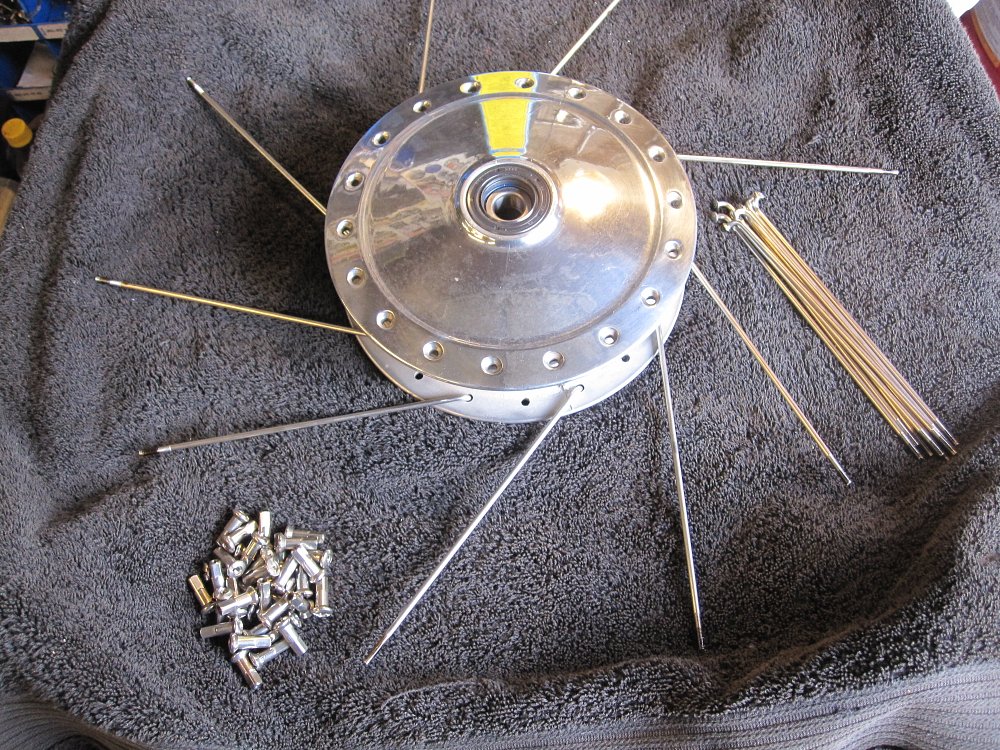 You will need a wheel truing stand, a properly sized spoke wrench, some anti seize, a measuring device and a workbench with an old blanket or towel to work on. A pair of bolt-cutters or an angle grinder with a cutoff wheel helps disassemble the wheel quickly if you are replacing the spokes.