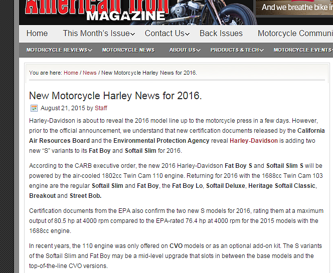 American Iron magazine posted an article that has since been taken down that spilled the beans about an interesting tidbit. Based on California Air Resources Board (CARB) and Environmental Protection Agency (EPA) documents, the magazine reported that the MoCo is slated to offer at least a couple new bikes, the Fat Boy S and the Slim S. Both are, presumably, variants of their parent bikes, both in the Softail family.