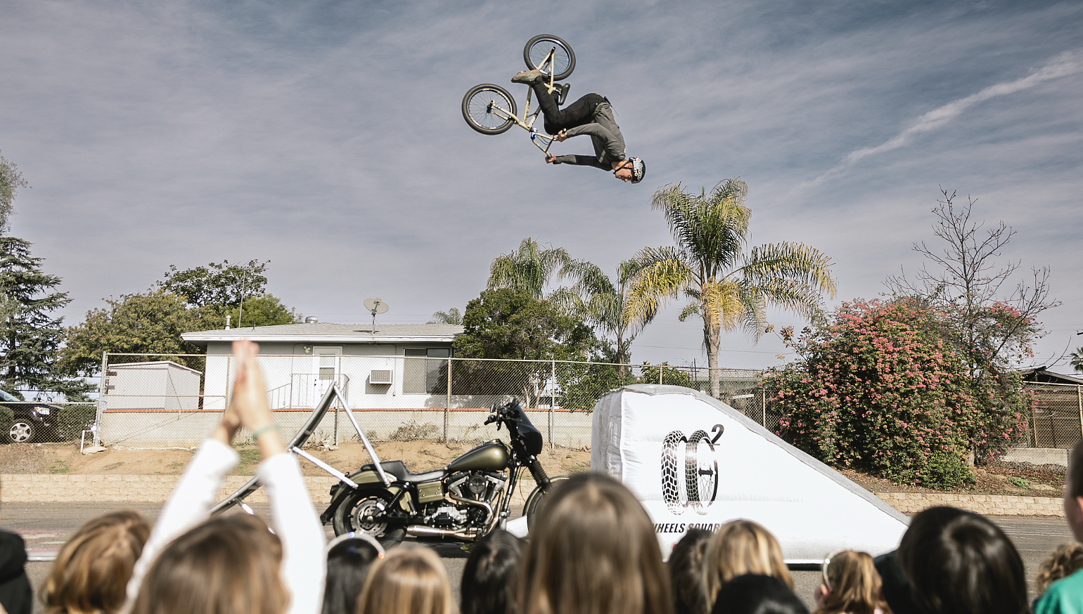 BMX shows are fairly common in SoCal — Jared says there are nine companies, several of which he’s worked for — but they’re all multi-person teams that get around in a truck, something Jared knows is inefficient. “I rode in and even ran other people’s shows, so I knew a one-man routine would work, but driving a truck felt like such a waste of time compared to riding,” he recalls.