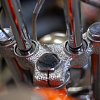 Additional accessories include pushrod and exhaust covers from Unicorn Flakes and a Demon Lung flail shift nob for the jockey shifter. Cloth-covered wiring and a spattering of well worn secondhand parts, along with the handmade alloy embellishments, bolster this Shovelhead's vintage look.