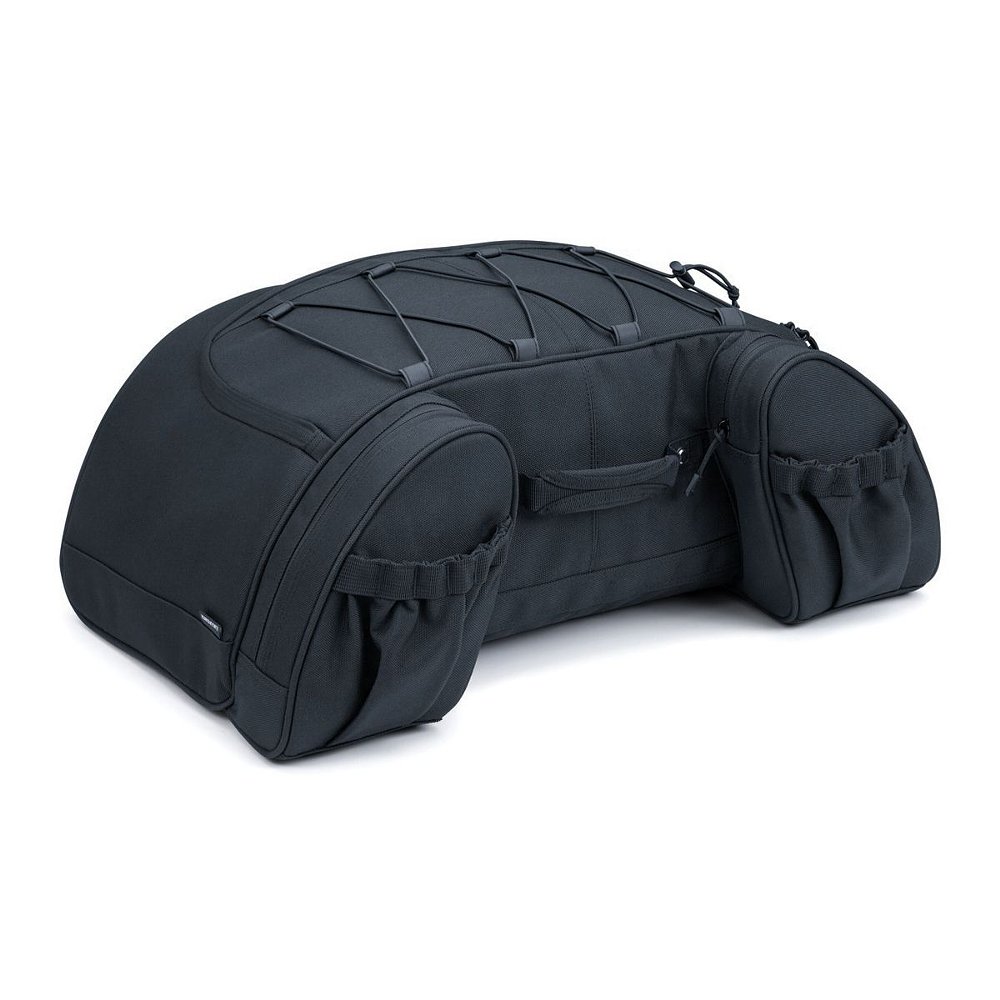 Kuryakyn’s Momentum Hitchhiker Trunk Rack Bag also mounts easily on a touring luggage rack thanks to its combination of elastic shock cords with hook-and-loop fasteners. Not quite as capacious as the Nelson Riggs Hitchhiker, its 23” inches long by 14” wide and 9” high. It has an external bungee storage system for bedrolls and the like and has a couple of extra forward-facing external pockets a passenger can access while in motion. It also has Molle modular attachment points for further utility.