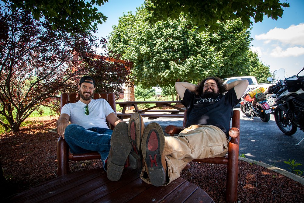 July 11, 6:18-6:38 p.m.: Make camp. Spurgeon talking some guy's ear off. For a guy who hates choppers, he sure likes talking to chopper people. Tell him we need to start getting some photos. Walk four feet. Spurgeon meets rider on modern Triumph. Will not shut up about Triumphs.