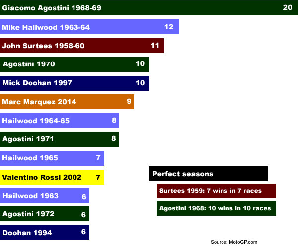 With Marc Márquez approaching the record for consecutive wins in the top class of grand prix racing, it's time for some MotoGPerspective. The chart below shows every win streak of more than five races in the top class (500cc or MotoGP) of grand prix motorcycle racing since the modern era began in 1949, based on official MotoGP records.