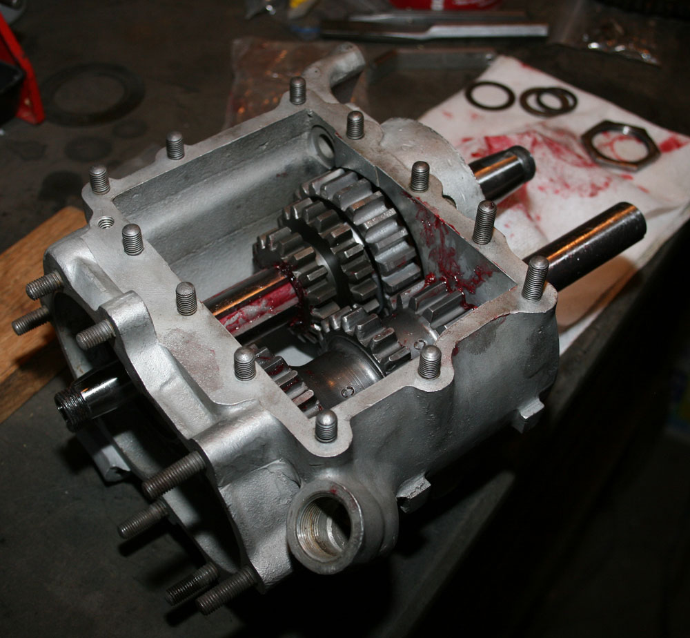 While the engine was off at the machine shop, I tackled rebuilding the transmission. The VLs use a basic three-speed transmission, and it was fairly easy to rebuild. While I was in there, I upgraded the main bearings with sealed bearings to reduce leaks and replaced the worn shafts and slider gear with new units.