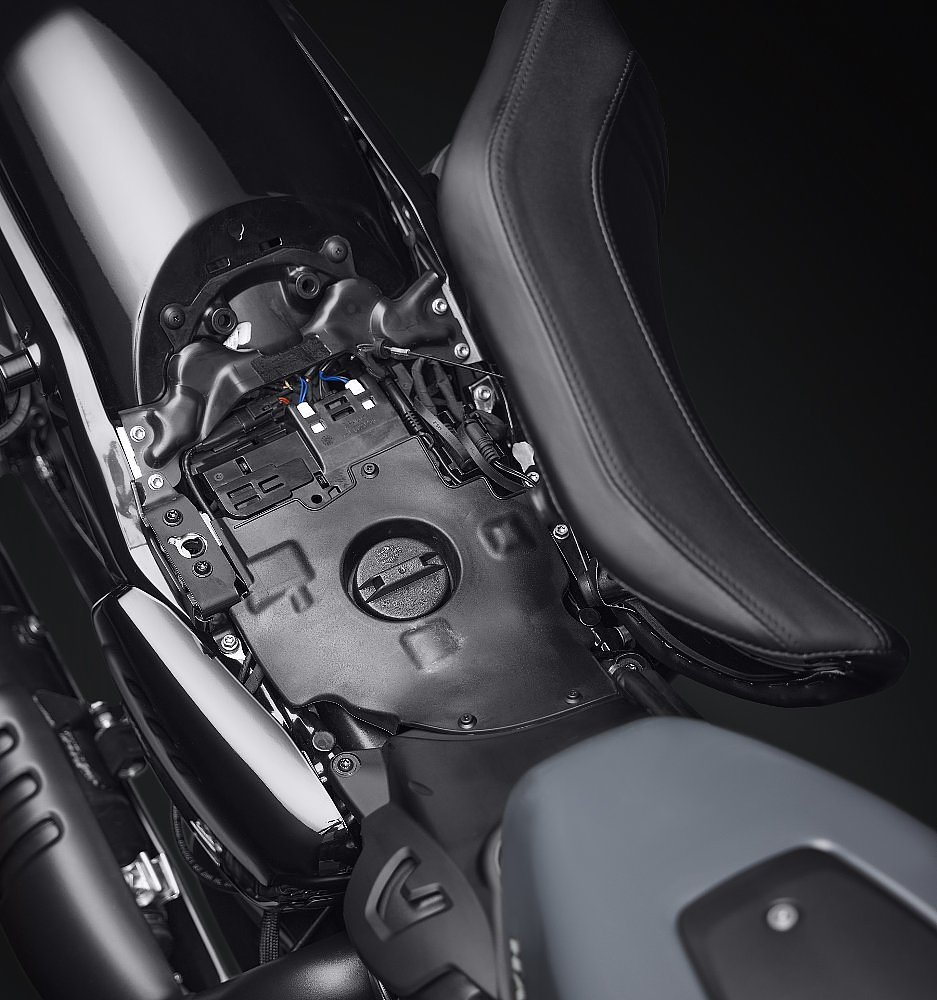 Harley-Davidson put a shroud around the radiator, and also around the battery, which lives in front of the engine behind the front wheel. They tried to carry on the look of the old Sportsters with the peanut tank, but that's not actually a fuel tank. It's really just a cover over a larger airbox that allows the engine to breathe better. The fuel tank is plastic and it's located under the seat.