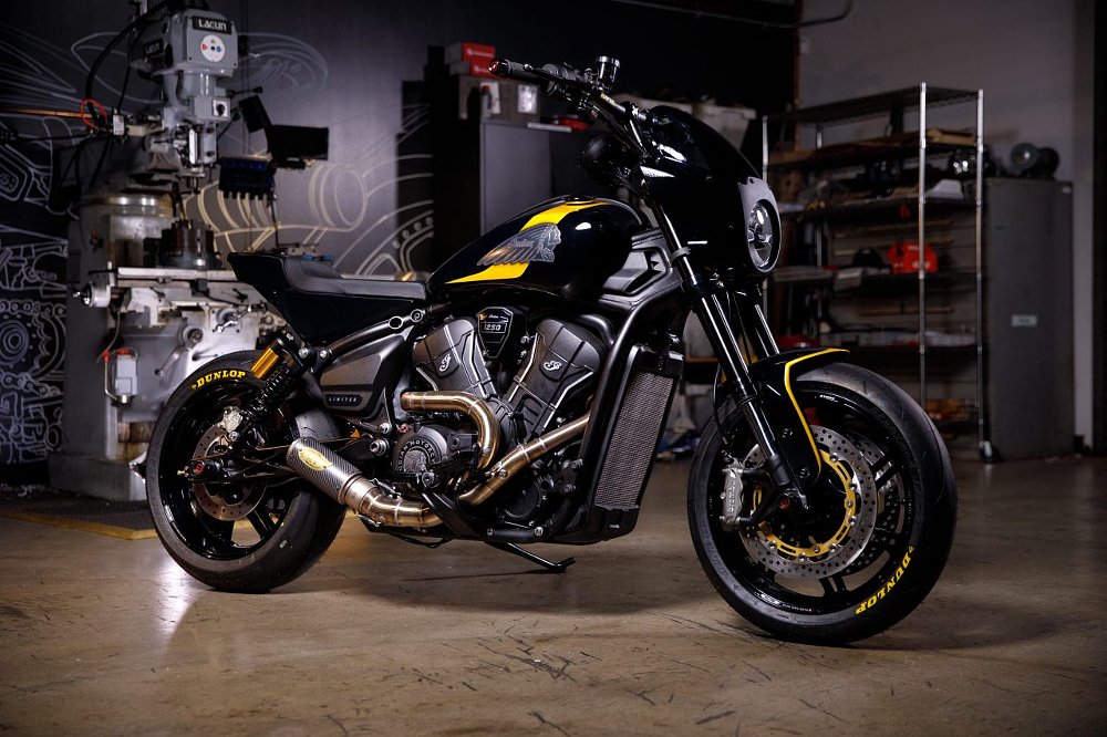 Whether it be the custom girder front end or the classic teardrop gas tank, the high pipes or the retro paint job, Olsen transports the liquid-cooled Scout back to a simpler time. She even swaps the rear shocks for steel struts and adds a sprung seat. Proper old-school stuff. Admittedly my favorite build among the bunch, the era-honoring bobber puts the Scout’s custom potential on full display.