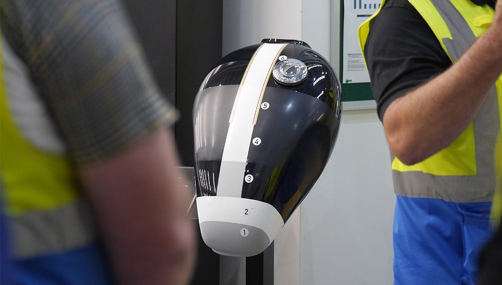 Admittedly, much of the tour centered on statistics and production quotas. I, on the other hand, cared less about the X number of crankshafts shipped weekly or the Y pounds spent on the state-of-the-art paint facility (it’s £4 million, by the way). What was fascinating to me was the paint booth’s waterfall back wall, which captures errant paint to be filtered out by Triumph’s advanced processing system.
