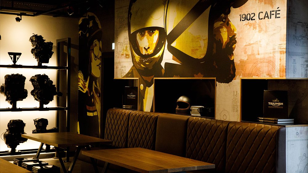 We pile out of the coach, still buzzing from the TR Series launch the evening before. The British OEM’s Moto2 prototype greets visitors as they enter through the 1902 Café. The café itself looks transported from a trendy Soho neighborhood, except for the landmark Triumph engines decorating the back wall, of course.