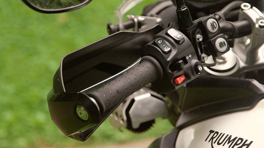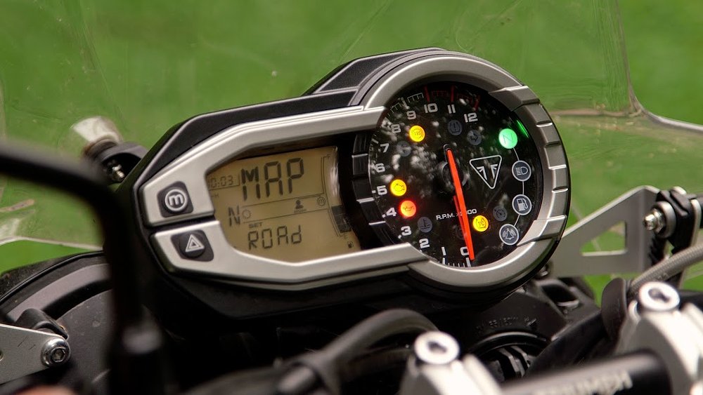 The Tiger 800 XCx comes with additional hard parts, such as crash bars, plastic hand guards, an aluminum skid plate, and a center stand. An advanced computer provides information on fuel consumption, hours and miles traveled, and the ability to enable self-canceling turn signals. But the real upgrade is the electronics package. Riders get to choose from three modes: On Road, Off Road, and Rider mode, the last of which is completely programmable. Once in Rider Mode, you can choose from four different throttle maps, Rain, Off-Road, Road, and Sport, ranging from least to most sensitive.