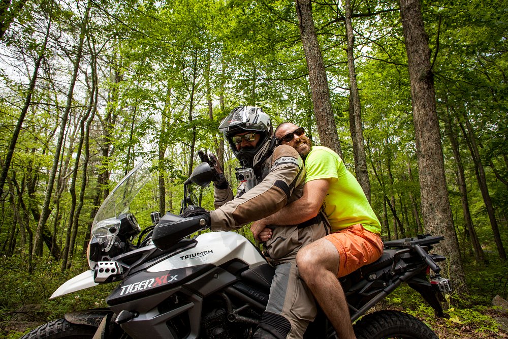 Gearing up for the following weekend’s shoot, I stripped the bike of said luggage, installed the Mitas E-07s, and set out with the RevZilla video team to Bald Eagle Mountain, the site of AltRider’s annual “Conserve the Ride” event. With promises of beer, a pig roast, and excellent on- and off-road riding opportunities, we couldn’t think of a better location to put the new Tiger 800 XCx to the test. Over the next three days, I tackled everything from twisted pavement, to dirt roads, gnarly dual-track treks and even some light single-track trails.