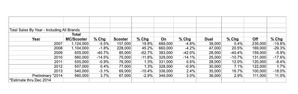 By segment, off-highway bikes saw the most growth, moving 81,013 for a 10.9 percent increase over 2013. Sales of dual-purpose bikes were up 3.6 percent with 34,497 units sold, and on-highway motorcycles are up 3 percent with 334,488 units sold. Scooters were the only category to lose ground, down 3.5 percent from 34,742 to 33,528 units sold.