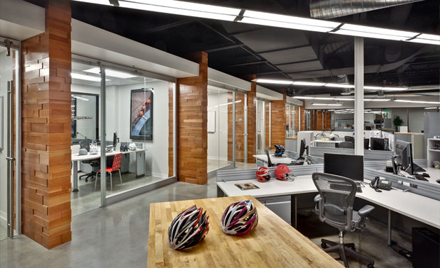 We walked through a set of glass doors into a large room full of cubicles. Don’t think Office Space, think Social Network. Lots of young-ish people dressed like they weren’t worried about a dress code in an atmosphere that felt designed for collaboration. As it turns out, I was standing amidst the teams for Giro Helmets, Bell Dirt Helmets and Bell Street. I immediately remembered being told about one of the ideas that came from Giro that was then modified for Bell’s street helmets. Now it made sense to me why they are able to learn from each other so easily – they’re sitting next to each other, sharing what they were working on just as naturally as you share things with your friends at your office over lunch.