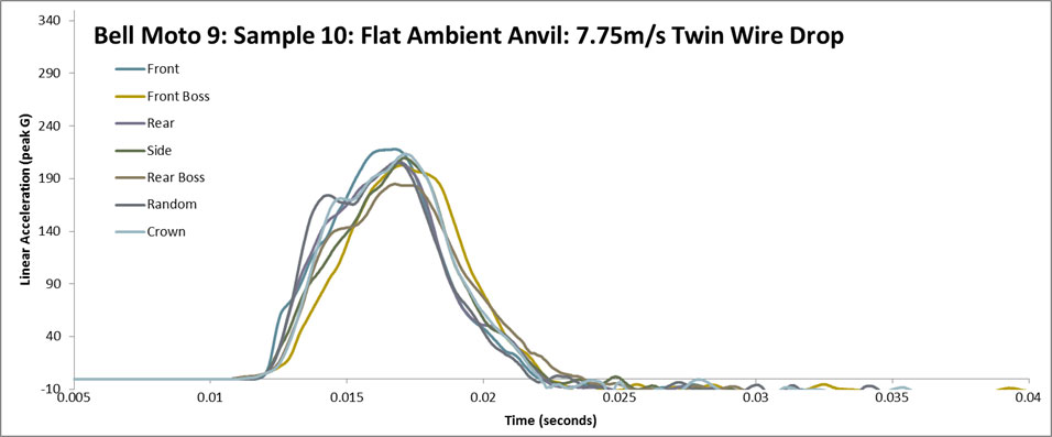 DOT requires that the helmet receive the same stress test, in the same place, twice in a row and still remain under the 300G mark. The tests on this helmet, which had already been crashed in, returned sub-200G levels.