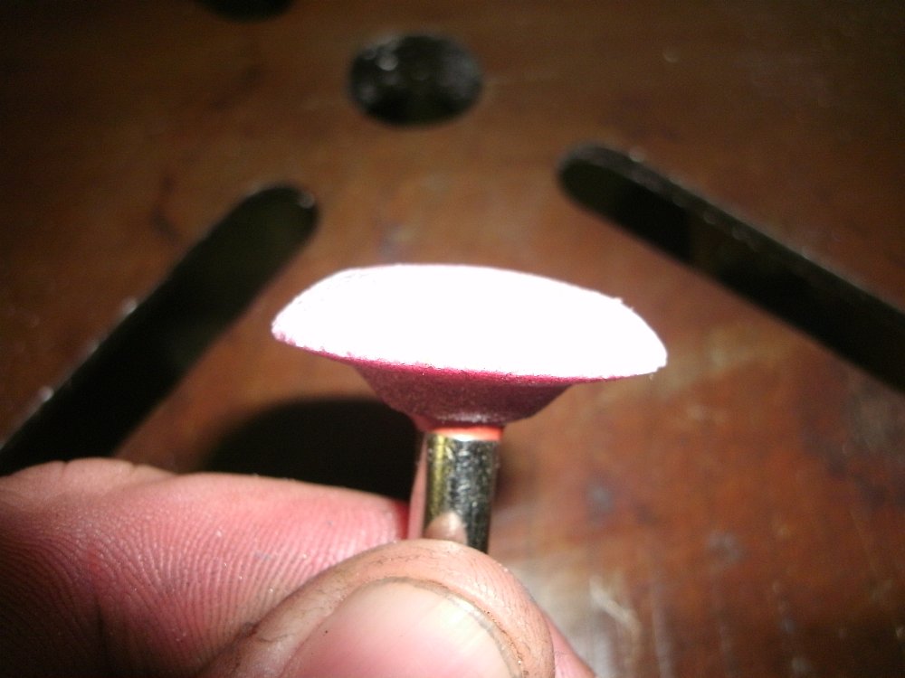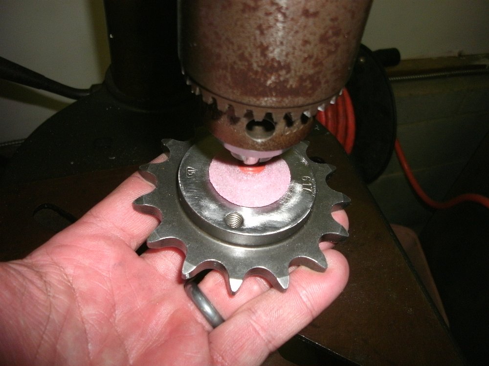 I ordered a 15-tooth sprocket for an XR650R, and test fit it. Mounted backwards, it fit the shaft beautifully in every way except for its depth. It would not slide inboard far enough for the sprocket keeper to slip into its groove. I considered facing the entire sprocket in a lathe. That method would probably work well. The solution I finally employed, though, was slightly different. I put a shank-mounted stone with a very convex face in the chuck of the drill press, and began removing material from the center of the sprocket.