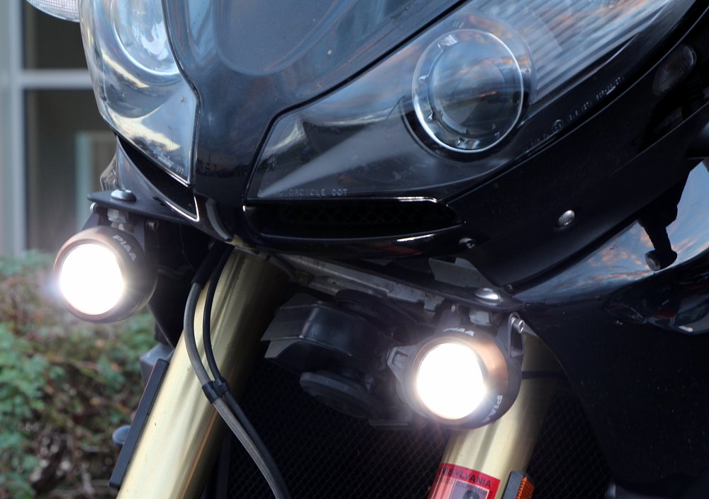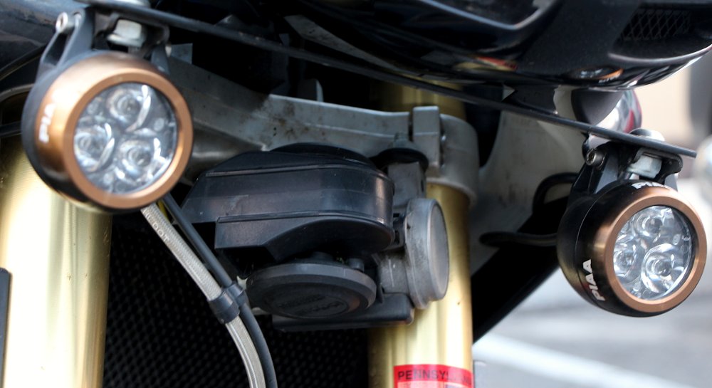 Buzzsaw's PIAA LED lights are great for seeing - and being seen! RevZilla photo.Instead, I swear by my PIAA auxiliary LED lights. The Tiger, like many bikes, is woefully under-equipped in the lighting department, with a single H7 halogen low-beam bulb. I don’t know if it’s the unconventional arrangement of the lights that catches motorists' eyes or if it’s the difference in light color temperature, but it seems as though the oncoming traffic now sees me. I get the added benefit of better depth of light down the road. Because LEDs have such a low power draw, I no longer worry about taxing the Tiger’s modest power output. Stay away from those cheap junkers Lemmy bought, though. The good ones are expensive because they dissipate heat well to keep the lumens up and retain long life. You get what you pay for. Fly-by-night bulb company, I offer you a turkey.