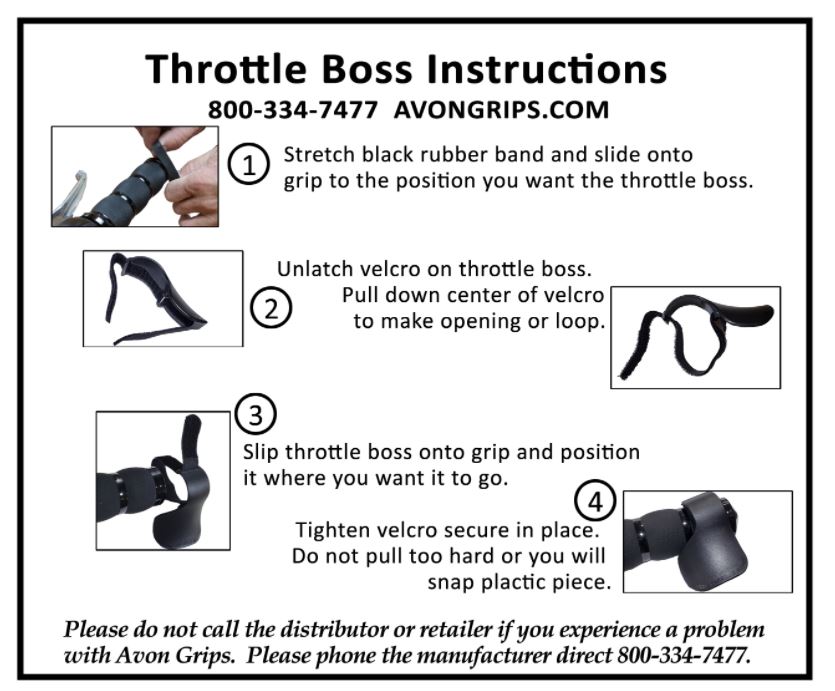 The Avon Grips Throttle Boss will assist with those hand cramps and tingles. Easily slide the Throttle Boss into the position desired and tighten Velcro.