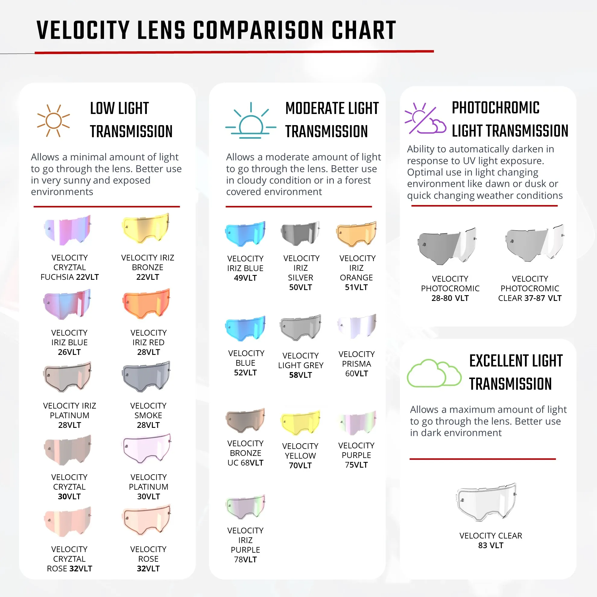 The Velocity 6.5 series of goggles by Leatt have undergone a variety of impact tests and feature WideVision anti-fog lenses, these goggles offer optimal visibility.