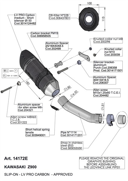 The Leo Vince LV Pro Slip-On offers a dynamic blend of aggressive sound, power, and style. Its stainless steel inlet is TIG-welded to the muffler body while the distinctive carbon fiber end cap features an asymmetrical and aggressive cut. The all-carbon muffler clamp adds to the exhaust's aesthetic excellence.