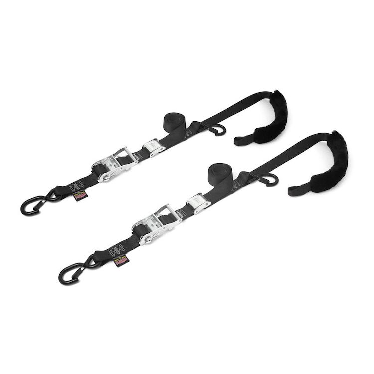 Combining the strength of a ratchet with the convenience of a cam buckle, this tie-down is definitely one-of-a-kind. Only one person is needed to anchor a motorcycle by tightening both straps at the same time. Latch hooks keep your bike from falling over and the soft plush cover that is sewn in on the tie-down protects your paint and chrome surfaces.