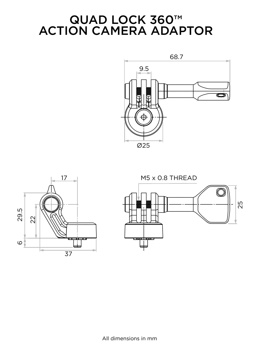 The Action Camera Adapter is a versatile accessory designed to enhance your multimedia experience on the go. It effortlessly integrates your GoPro, action camera, helmet, action lighting, or similar devices with a Quad Lock 360-compatible receiver, making them compatible with all Quad Lock 360 arms and bases (available separately). Ideal as a replacement for the Quad Lock Head in a Quad Lock 360 Kit Build, it brings a seamless connectivity solution to your adventurous lifestyle.