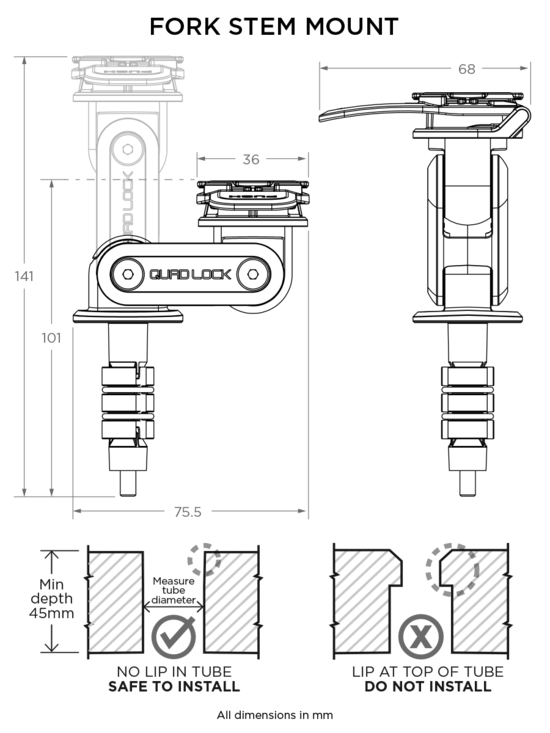 Designed for motorcycles that provide an open, hollow mounting location in the tube of the fork stem. The mount itself is adjustable for optimal height and viewing angle. Compatible with all Quad Lock cases and Universal Adaptor.