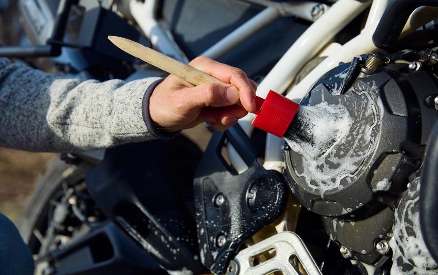 For under fender wells, engine, and exhaust tips, break loose stubborn dirt and grime with a wheel brush.